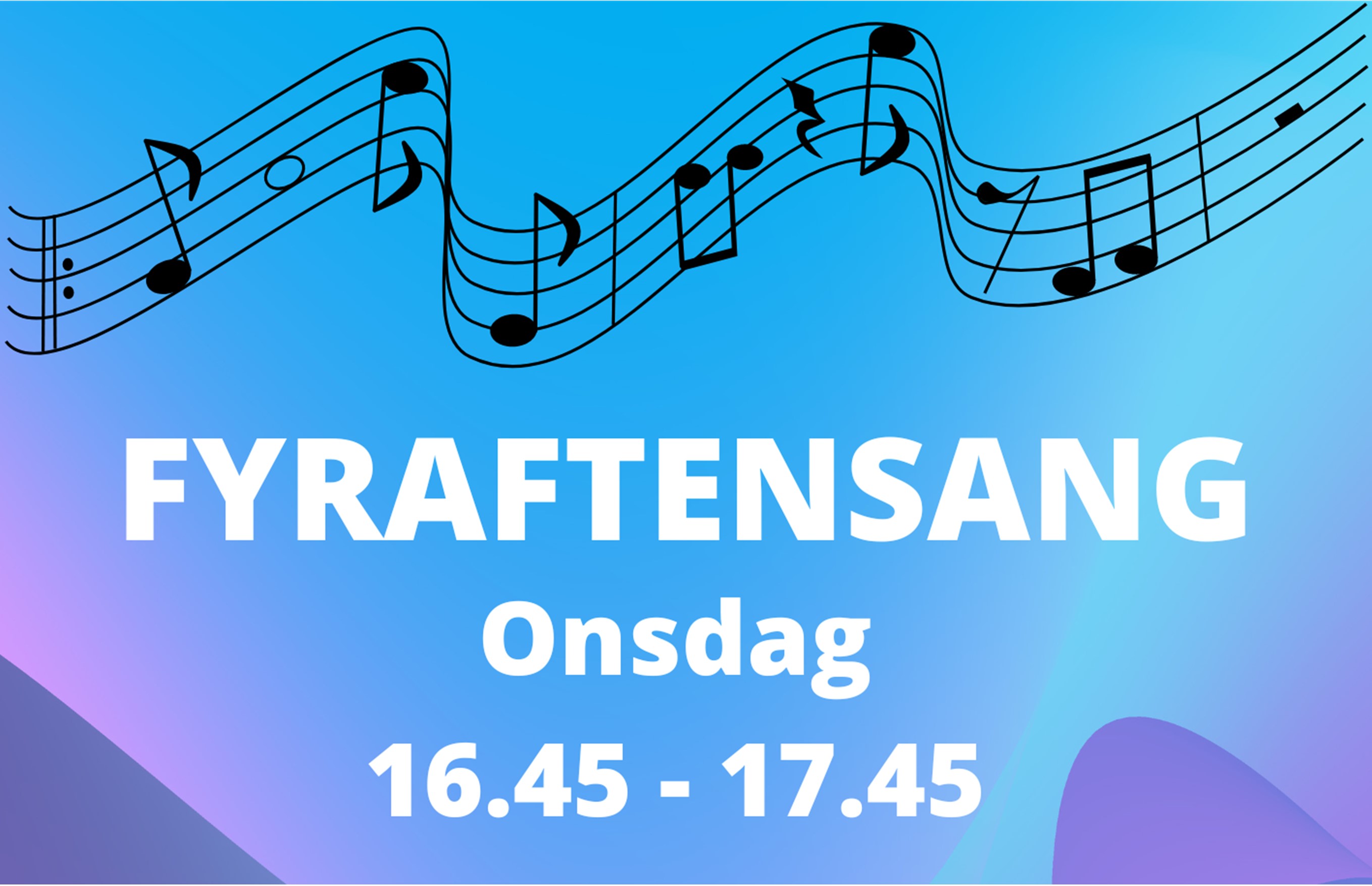 Fyraftenssang onsdage kl. 16.45 Det er gratis og for alle, og vi synger en time efter højskolesangbogen, under ledelse af Fredens kirkes organist og korleder Helle Majlund. Der er også plads til ønsker, hvis der er nogen der brænder for en bestemt sang. Der vil blive sunget en blandet buket, og mest danske sange, men også en enkelt af de nyere udenlandske. Vi har højskolesangbøger på stedet, så det eneste der skal medbringes er godt humør.