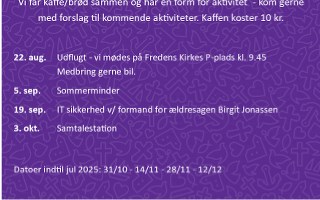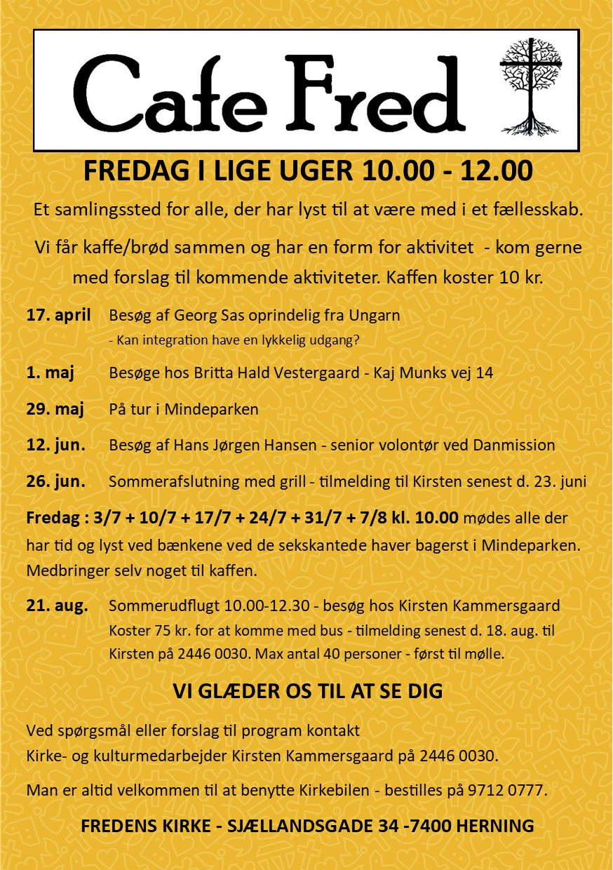 Det er op til jer, der har lyst til at komme i Cafe Fred, hvad den skal indeholde, for programmet bliver lavet ud fra deltagernes ønsker. Vi får naturligvis kaffe og brød hver gang - det koster 10 kroner.
