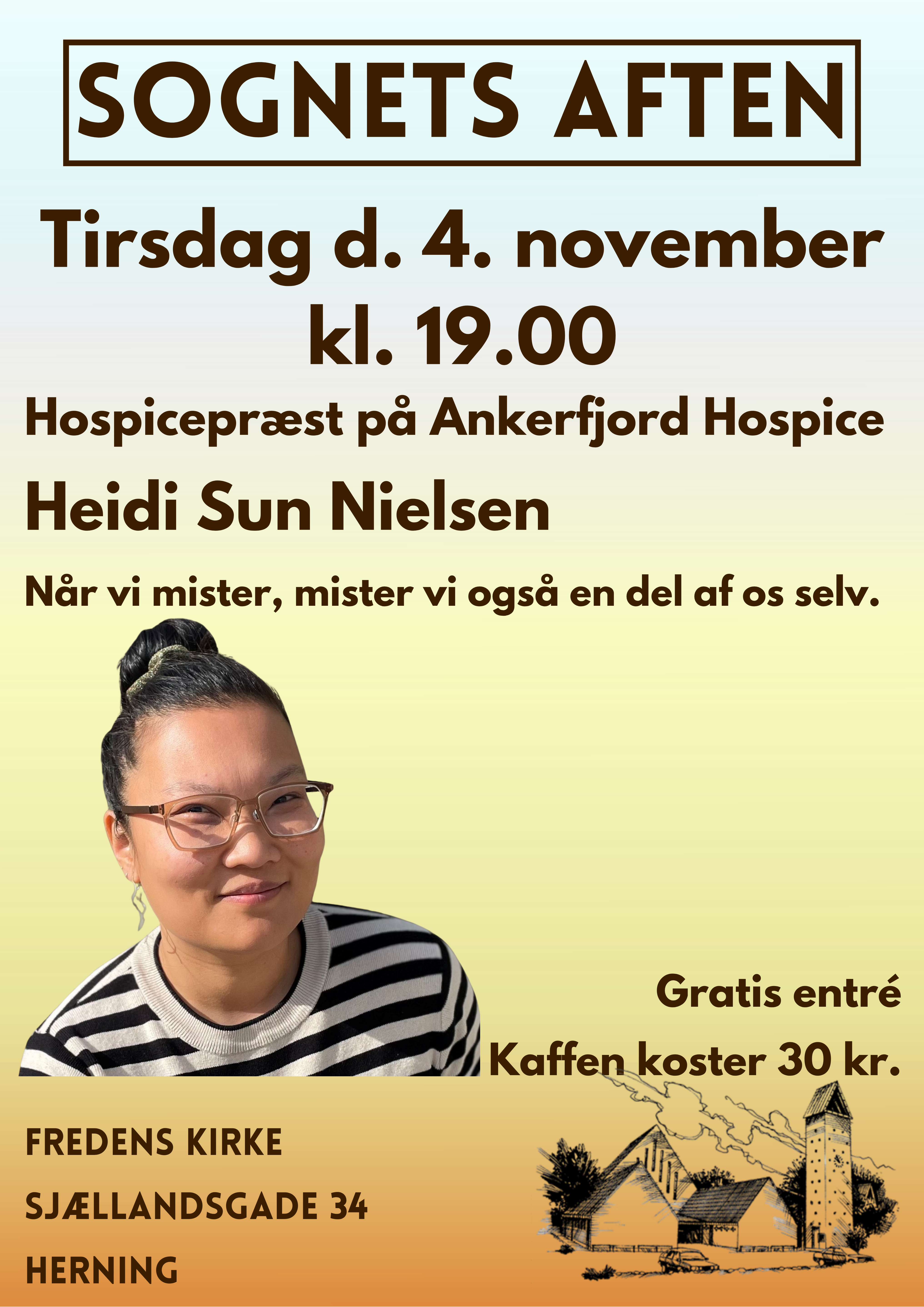 Hospicepræst på Ankerfjord Hospice Heidi Sun Nielsen: Når vi mister, mister vi også en del af os selv Som hospicepræst har jeg set, hørt og lyttet til mange, som kommer med en stor sorg. Når vi mister, mister vi også en del af os selv, og det tomrum bliver vi nødt til at tale om. For jeg mener at det kristne budskabs nerve er, at selve døden er en fødsel til noget nyt. Gratis entre. Kaffen koster 30 kr.